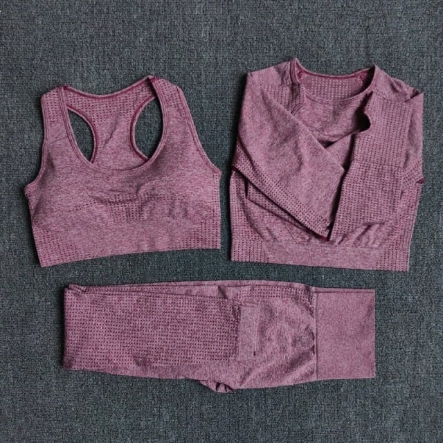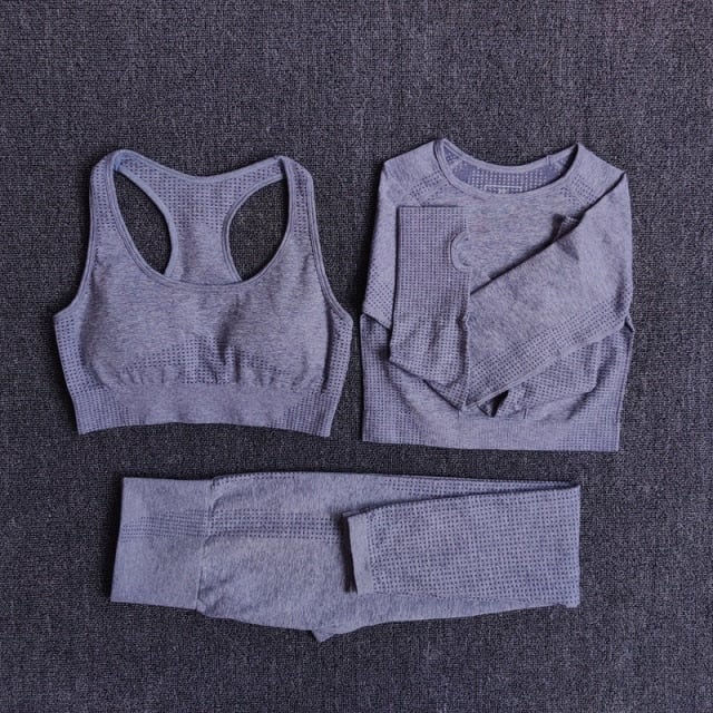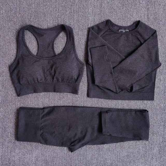 Maglietta corta (crop top) a maniche lunghe, reggiseno sportivo e leggings per l'allenamento.