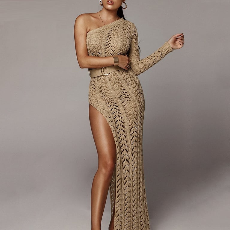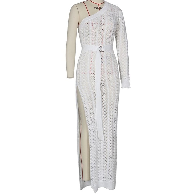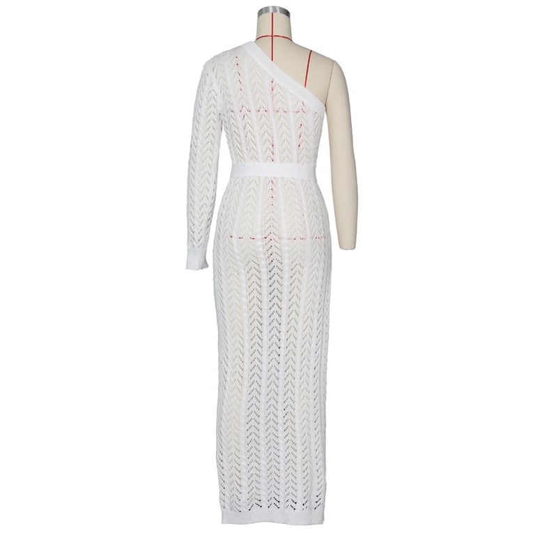 Bellissimo abito lungo all'uncinetto a spalla unica.