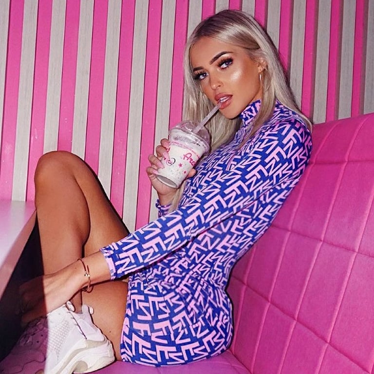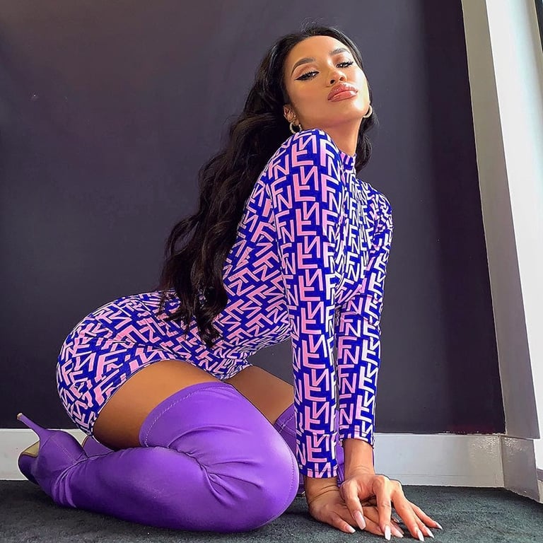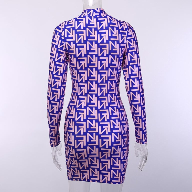 Moderno abito mini elasticizzato con collo alto e maniche lunghe.
