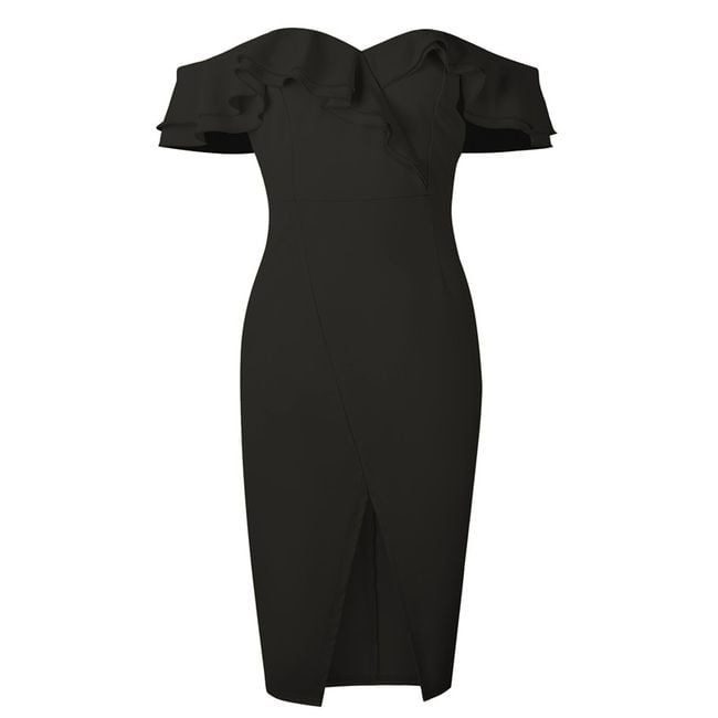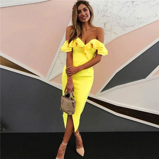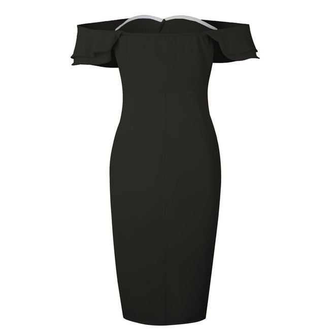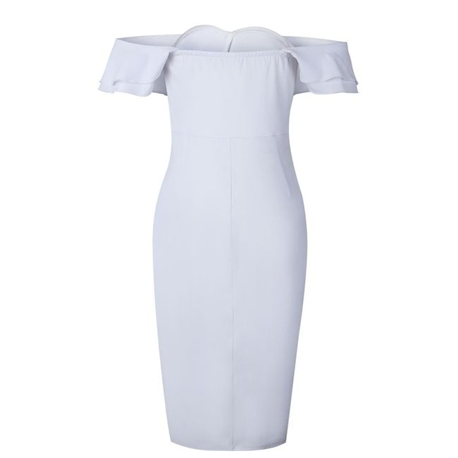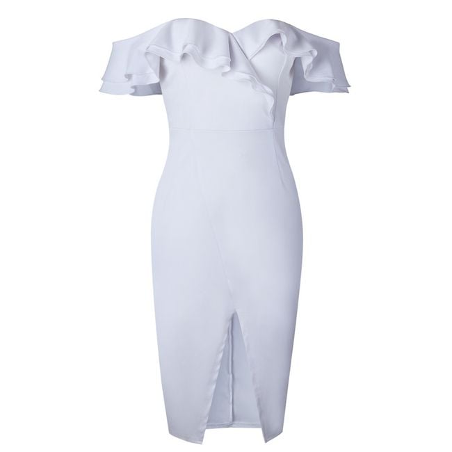 Abito aderente da donna senza spalline decorato con eleganti volant. Disponibile in 3 varianti di colore.