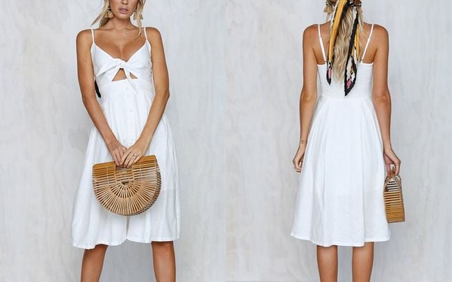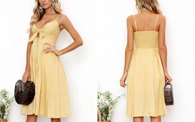Il vestito ha spalline sottili e una scollatura seducente,