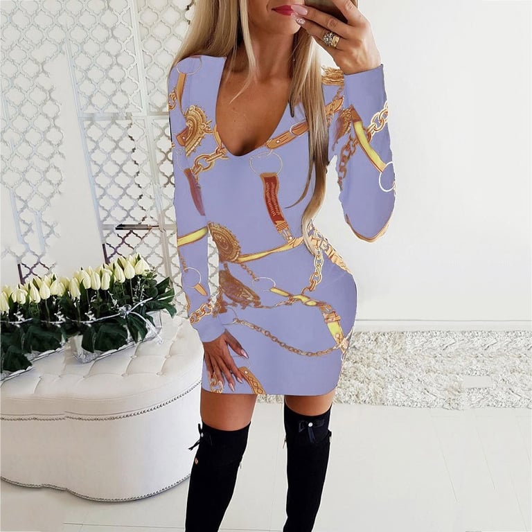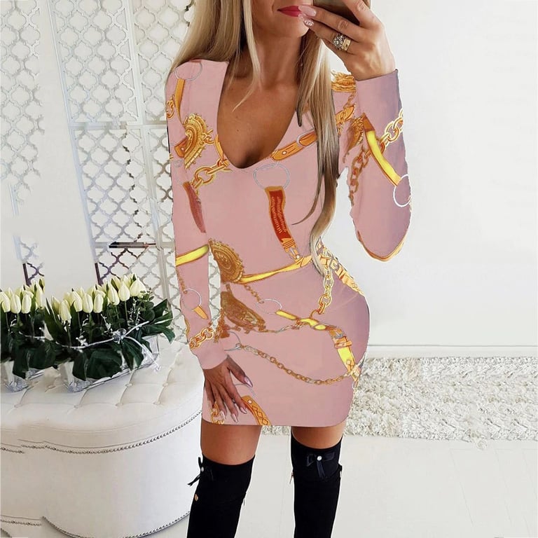 Abito da donna a tubino con scollatura a V. L'abito ha maniche lunghe ed è decorato con un motivo dorato.