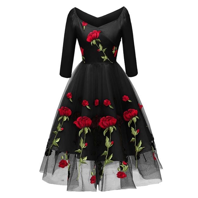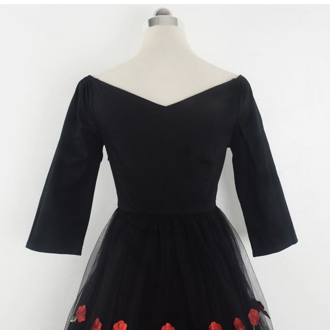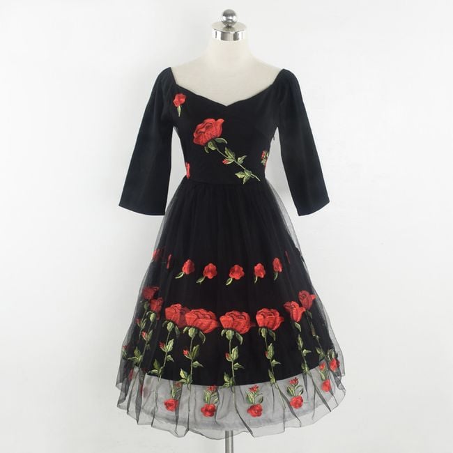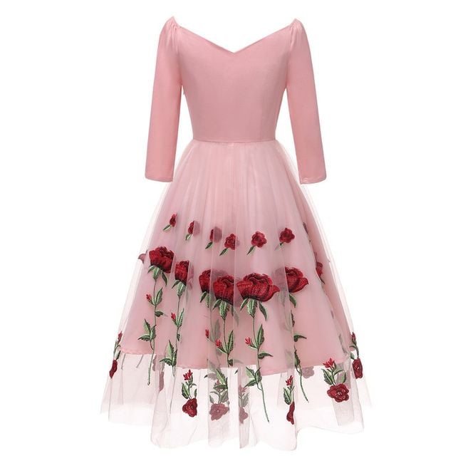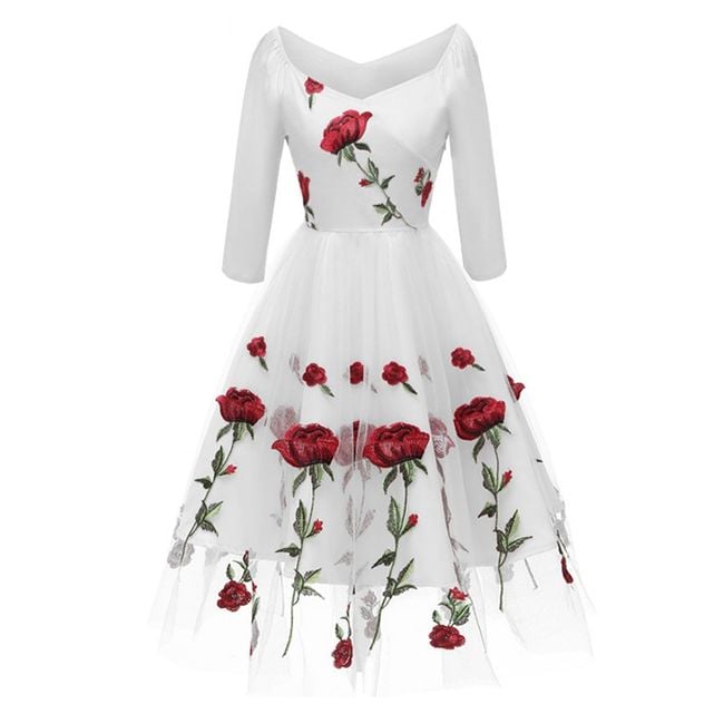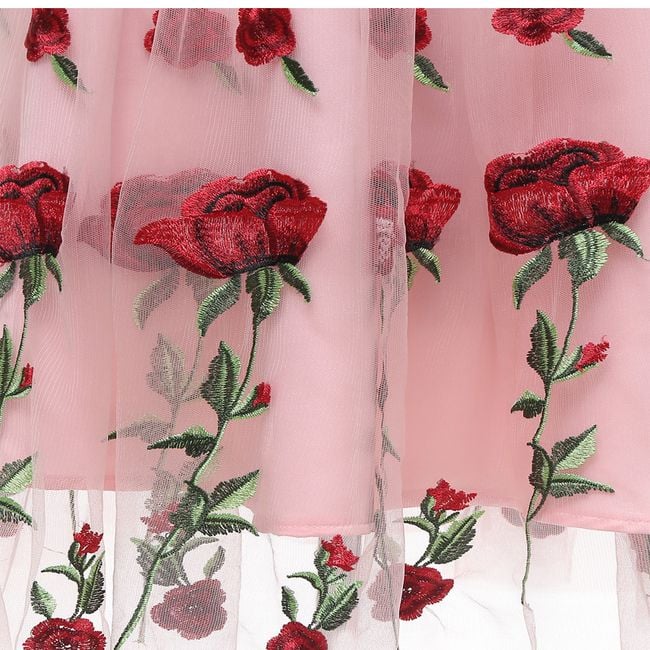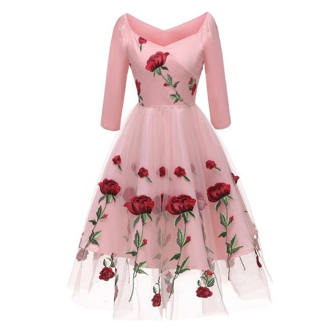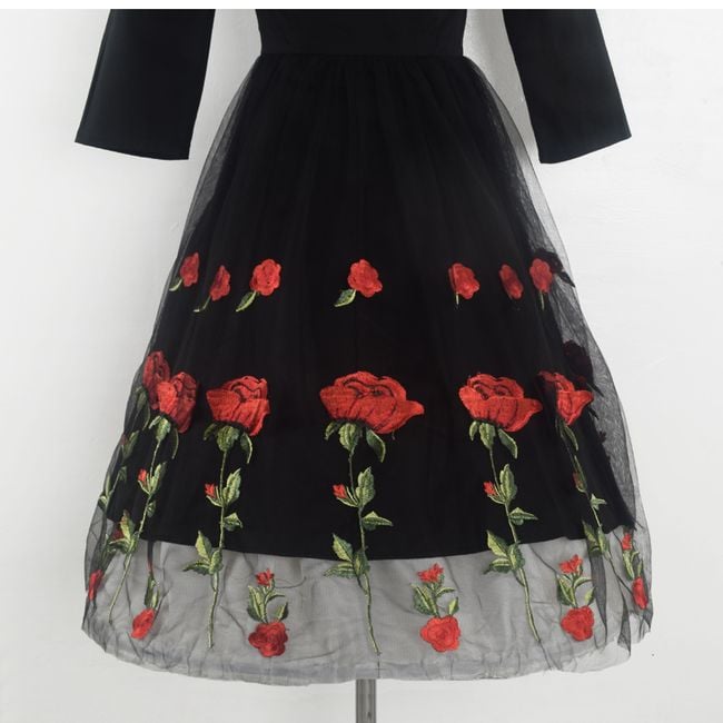 Il vestito ha una gonna ampia ed è decorato con bellissimi ricami.