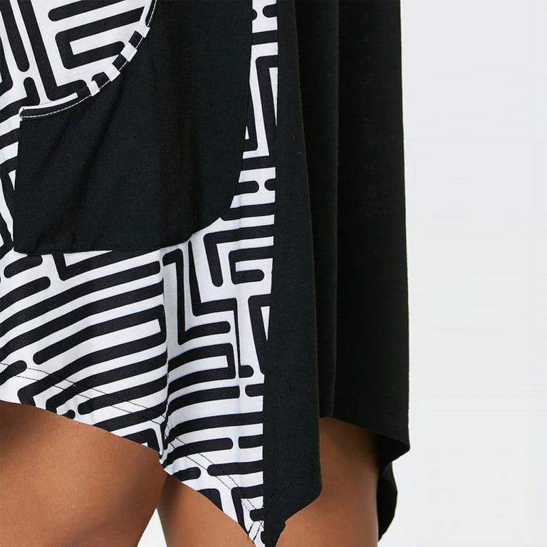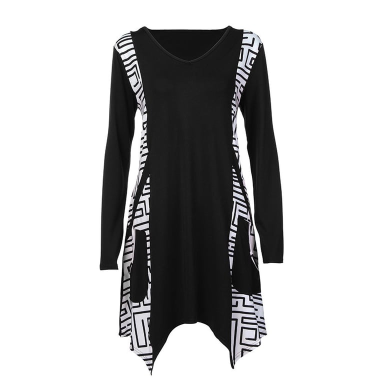 Abito da donna ampio con taglio asimmetrico. L'abito ha maniche lunghe e scollatura a V. Motivo geometrico sui lati e due tasche laterali. Disponibile in diverse colorazioni e taglie plus size.