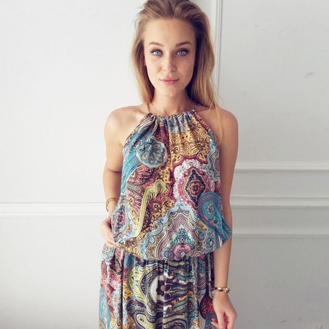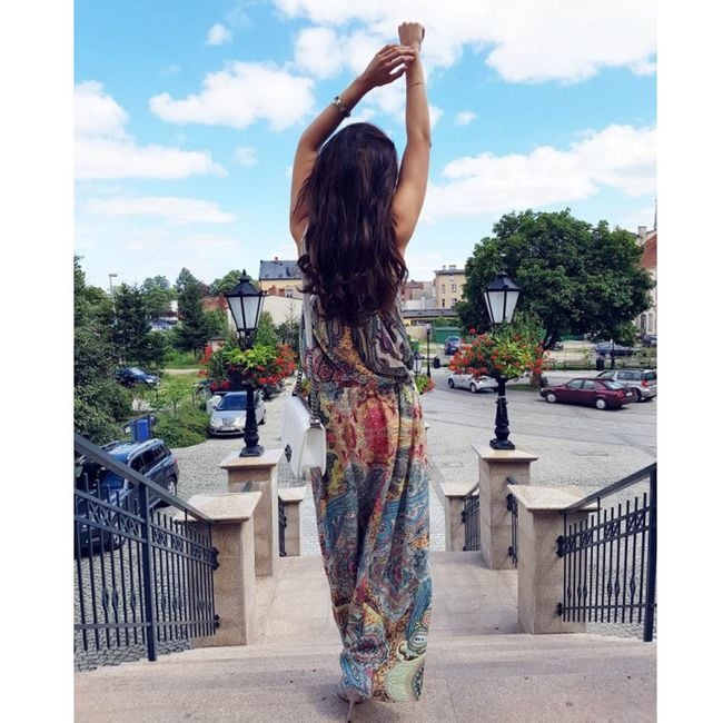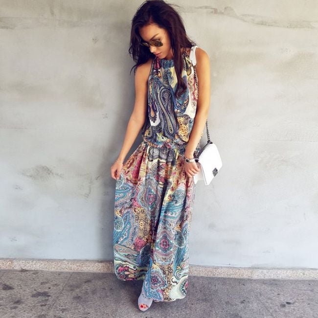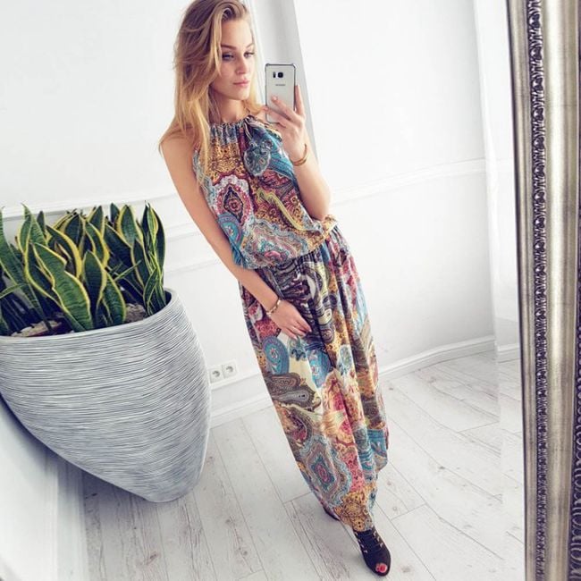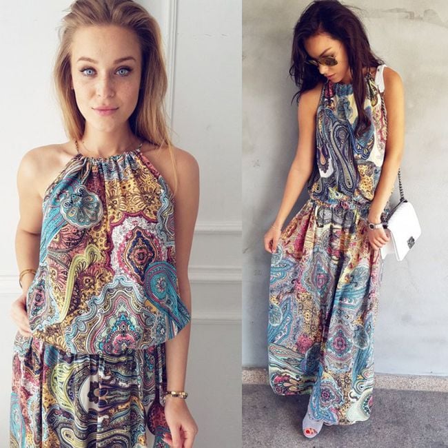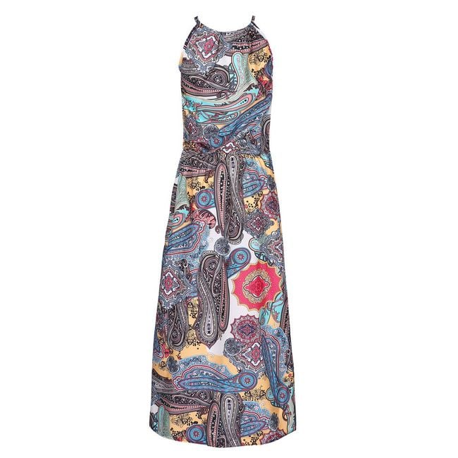 Questi bellissimi vestiti lunghi sono decorati con un motivo indiano multicolore. Hai a disposizione diverse taglie.