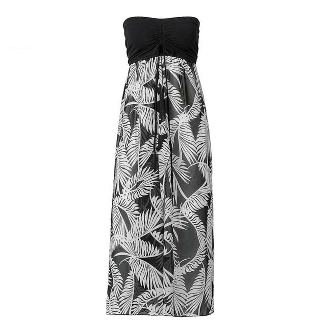 Abito da donna a taglio libero senza spalline, con una leggera gonna a motivo esotico e un piccolo spacco.