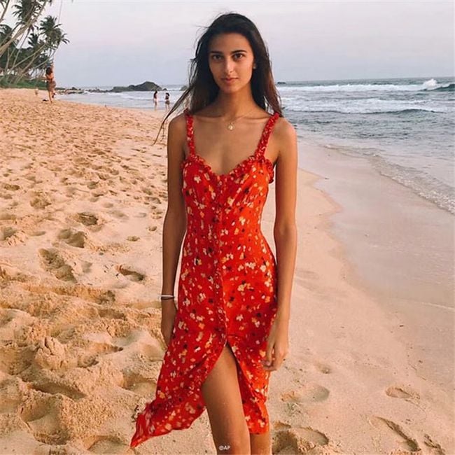 Abito estivo da donna con spacco presenta un motivo floreale estivo. Disponibile in 3 varianti di colore.