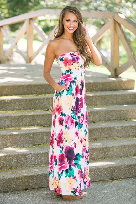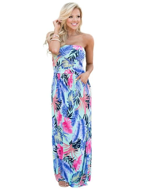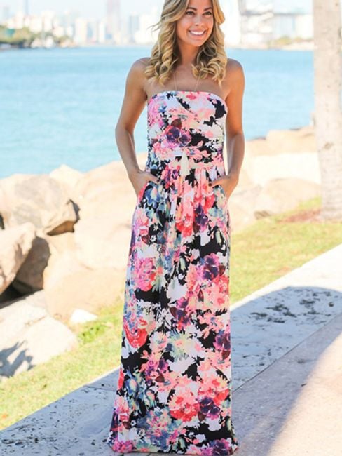 Abito da donna senza spalline, di taglio libero e con un motivo floreale originale. Disponibile in 6 varianti di colore.