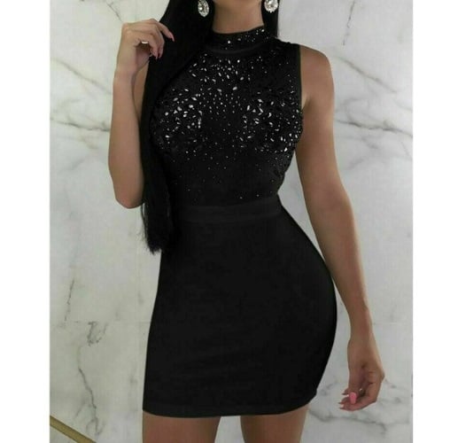 Abito da sera senza maniche di taglio aderente. Sottolinea magnificamente la vita, i fianchi e le curve femminili.