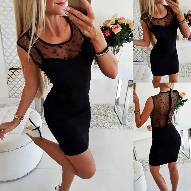 Abito da sera nero a tubino con scollatura rotonda. L'abito è decorato nella parte superiore con perle nere di diverse dimensioni.