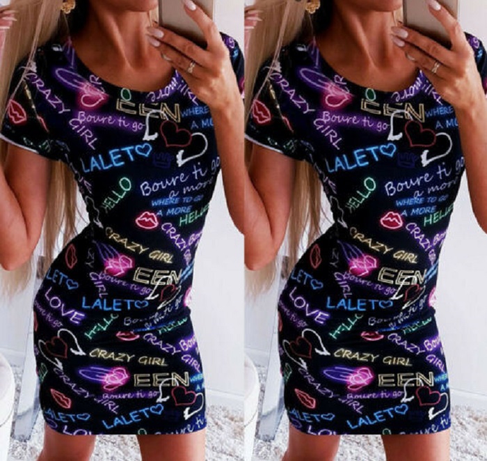 Abito mini da donna con maniche corte. Stampa elegante.
