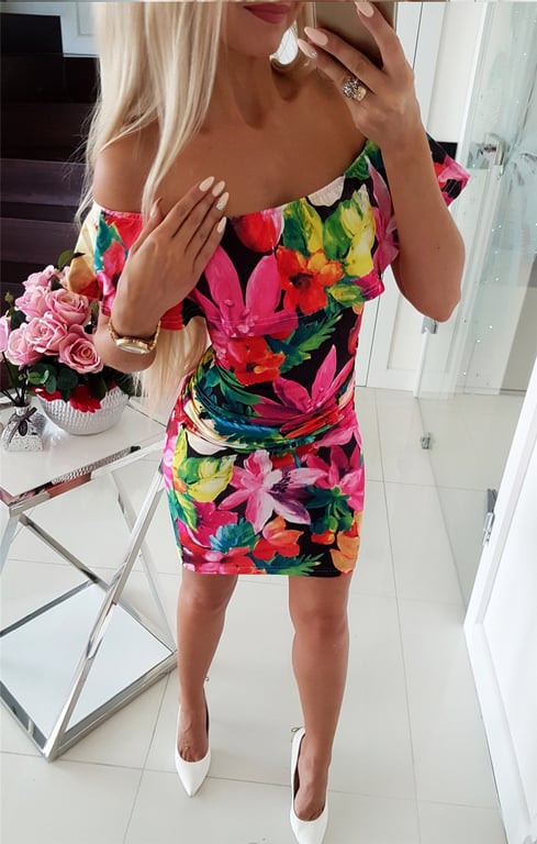 Abito estivo da donna con stampa floreale colorata. L'abito ha le spalle scoperte e un colletto a volant. Ha una vestibilità aderente ed è adatto per l'uso quotidiano.