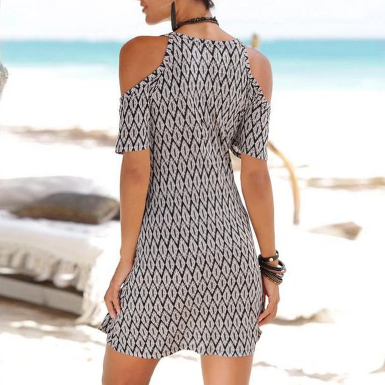Abiti estivi leggeri da donna con piccoli motivi. Gli abiti hanno le spalle scoperte e una gonna a forma di A.
