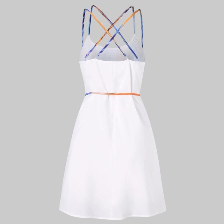 Abito estivo da donna con spalline sottili incrociate sulla schiena. Gonna a forma di A con vita elasticizzata. Stampa con motivo colorato di piume.
