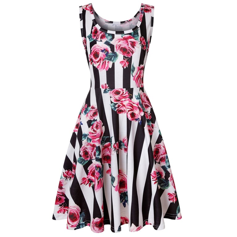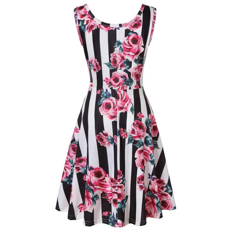 Abiti estivi da donna con rose, scollatura rotonda e spalline larghe. Gli abiti hanno una lunghezza fino alla metà della coscia, sono decorati con strisce bianco e nere e hanno una gonna a campana con volant.