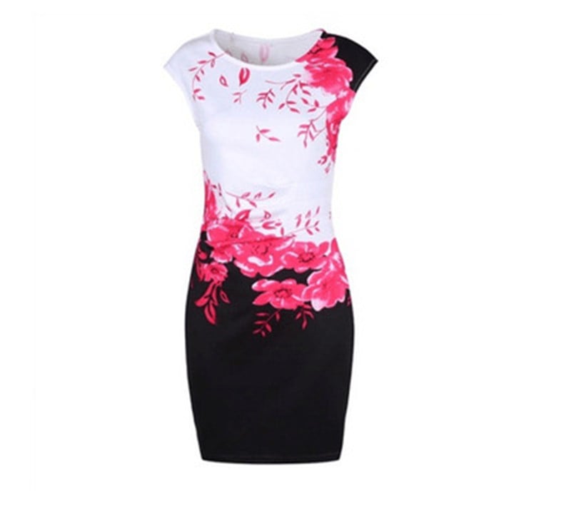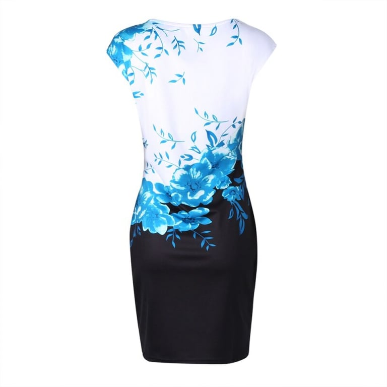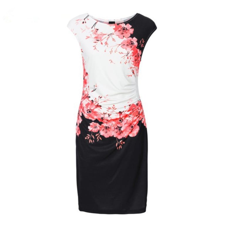 Abito estivo elegante da donna di taglio aderente con maniche corte e scollatura rotonda. L'abito presenta una stampa floreale.