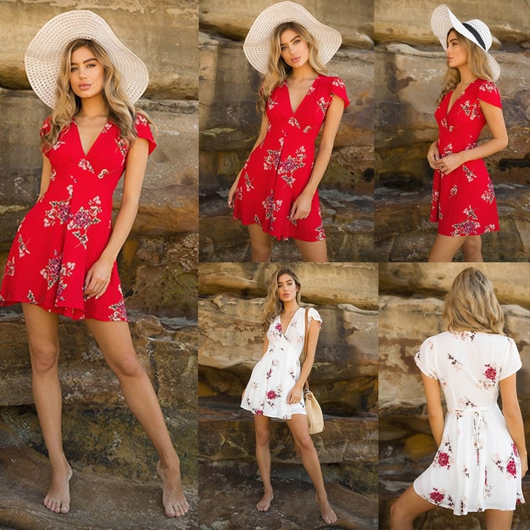 Abiti estivi leggeri da donna con motivo floreale. Disponibili in due colori: rosso e bianco. Gli abiti hanno maniche corte, sono la scelta ideale per l'estate.