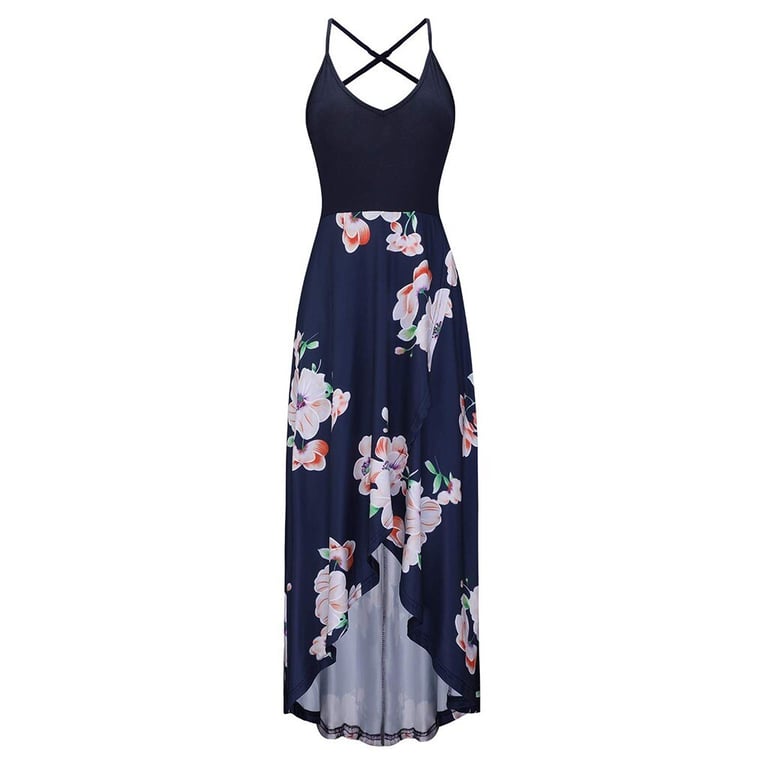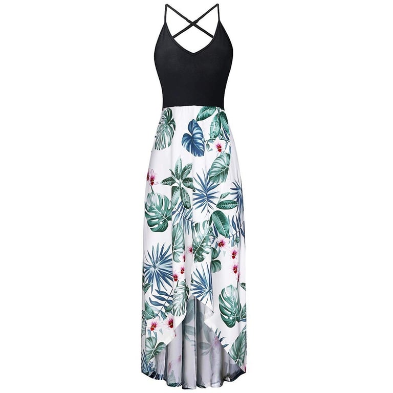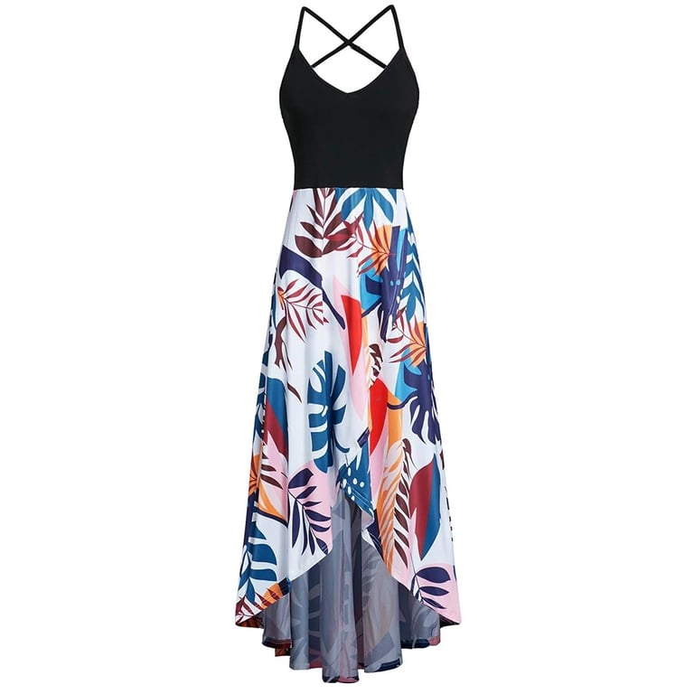 Abito lungo estivo da donna con spalline incrociate sul retro. L'abito ha una lunga gonna a forma di A con motivo floreale. La gonna è più corta nella parte anteriore e più lunga nella parte posteriore.