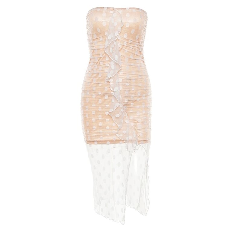 Bellissimo abito estivo a pois senza spalline con un alto spacco.
