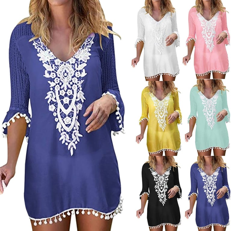 Abiti leggeri da donna per la spiaggia. Gli abiti hanno un scollo a V. Sulle maniche e sulla gonna, gli abiti sono rifiniti con piccole pompon.