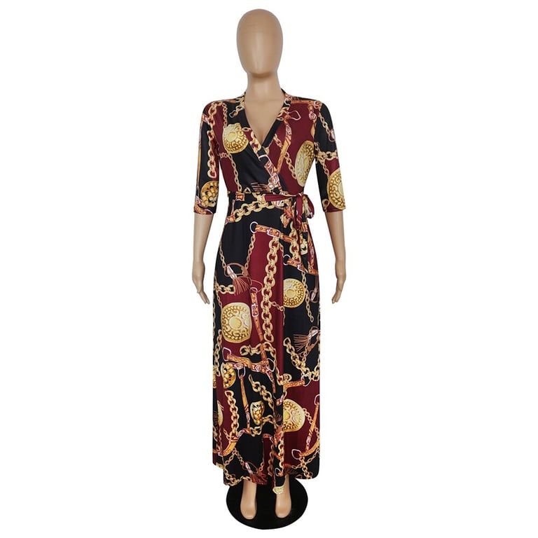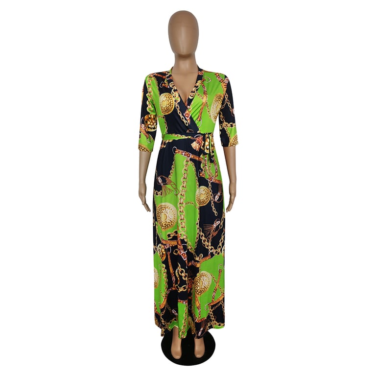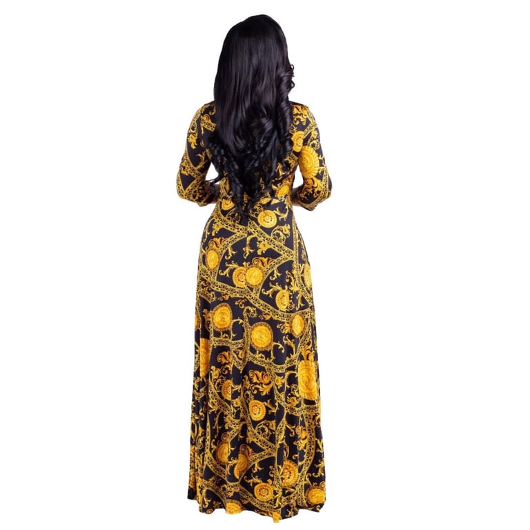 Abito lungo da donna con una stampa vivace.