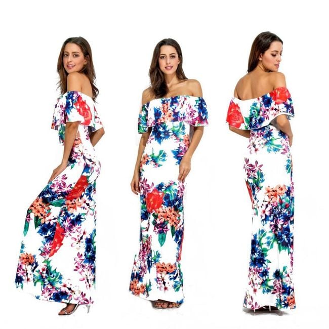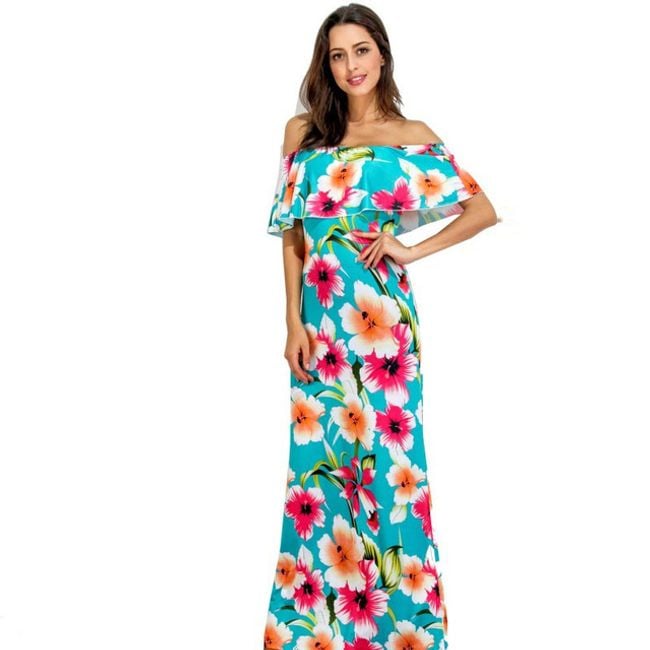 Questi vestiti estivi sono lunghi fino a terra. Sulle braccia e sul seno c'è una larga balza. I motivi sono originali e vivaci. Hai diverse varianti e taglie tra cui scegliere.