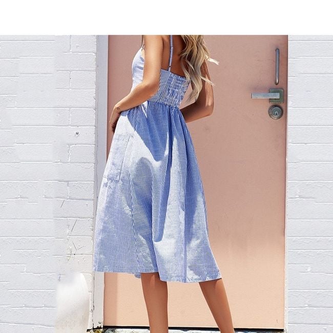 Un abito elegante a taglio libero con bottoni lungo tutta la lunghezza e spalline sottili. Disponibile in 2 varianti di colore.