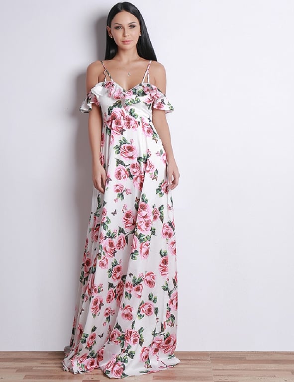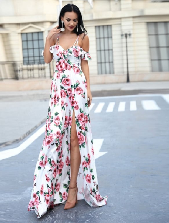 Bellissimo abito lungo estivo a fiori con spalle scoperte.