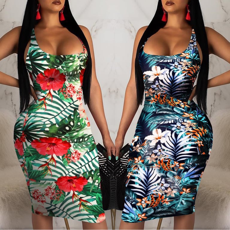 Abito lungo estivo da donna di taglio aderente. L'abito ha un collo rotondo ed è dotato di spalline larghe. L'abito è decorato con un motivo esotico.