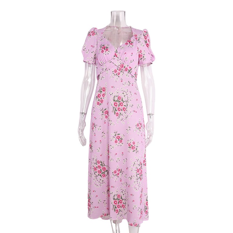 Abiti lunghi retro floreali da donna con maniche corte arricciate Kendall