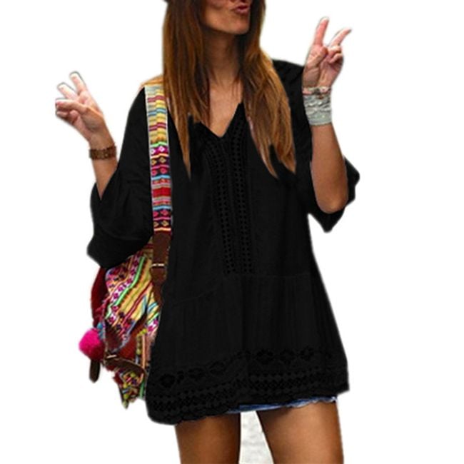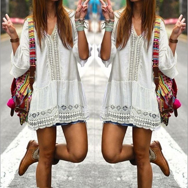 Abito mini libero con motivi in pizzo è perfetto per le donne che amano sentirsi indipendenti e libere. L'abito è principalmente molto arioso ed è una scelta ideale per la spiaggia o per un drink estivo con gli amici.