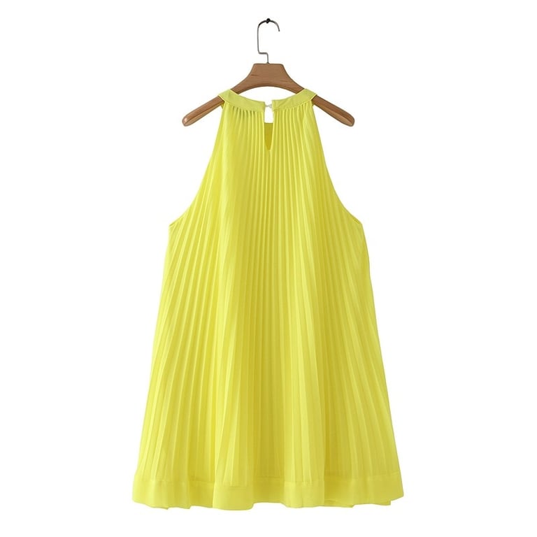 Abito estivo giallo brillante con scollatura a collo, di taglio più ampio.