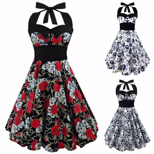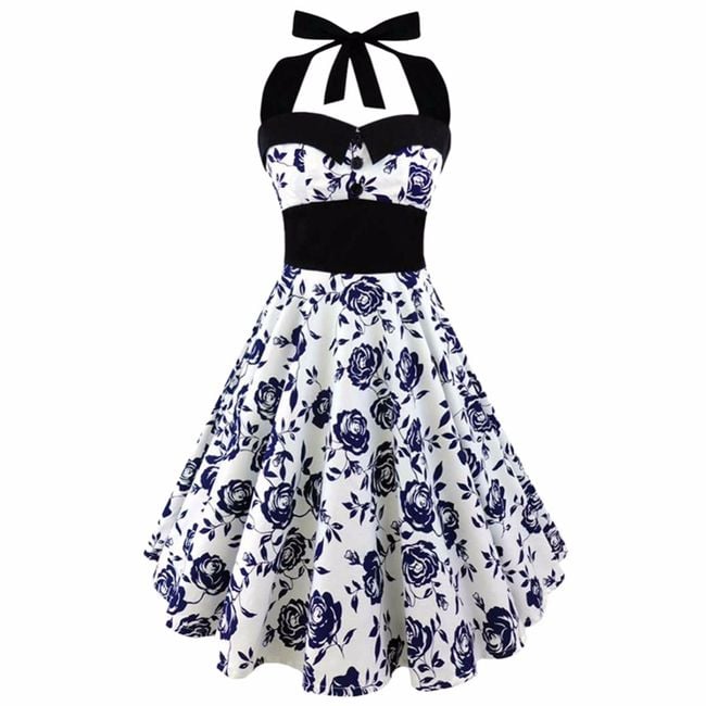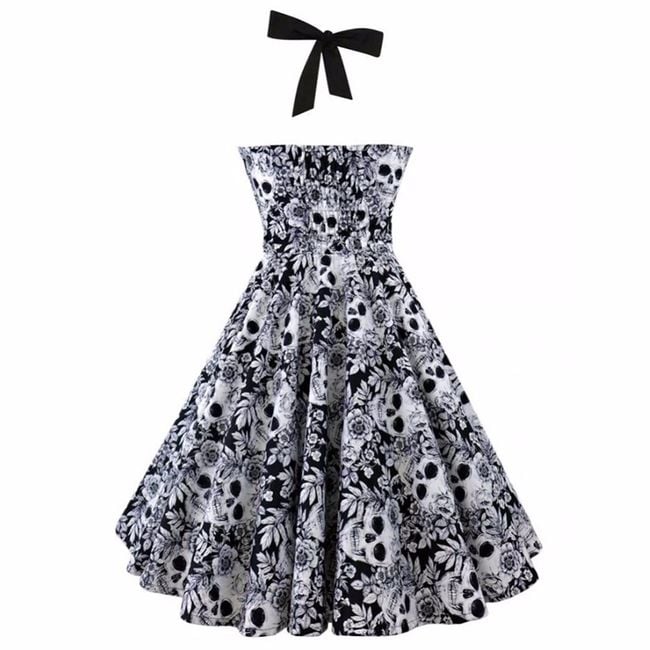 Il vestito ha un legame intorno al collo e ha un taglio retro.