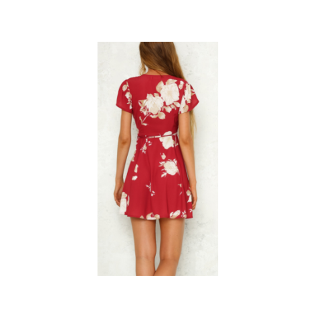 Il vestito è di colore rosso, decorato con rose bianche ed è adatto come accessorio per l'uso quotidiano durante il clima caldo.