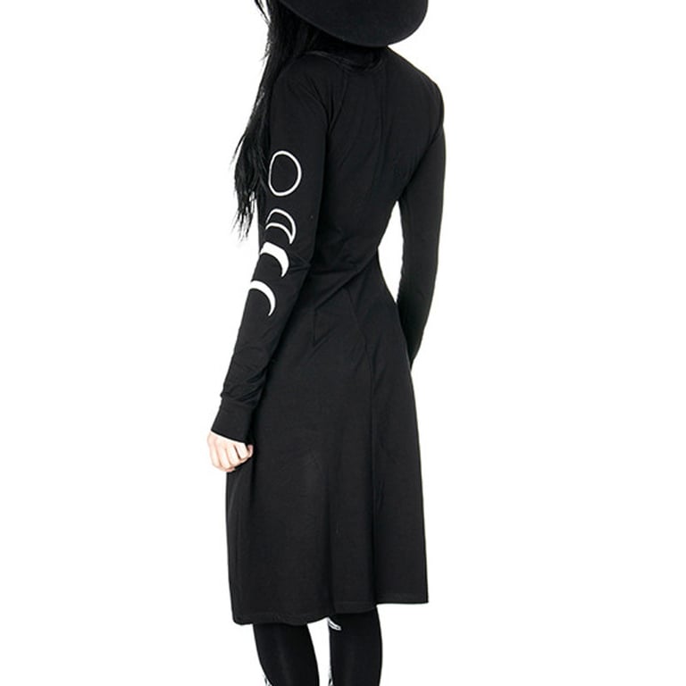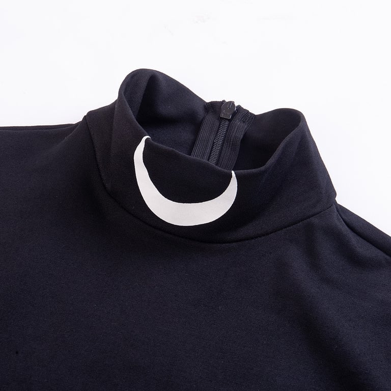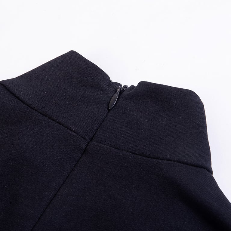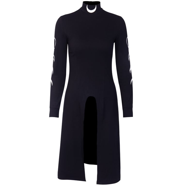 Abito nero con collo alto e spacco alto.