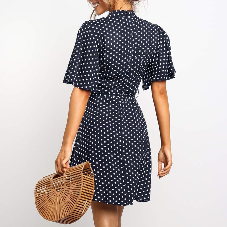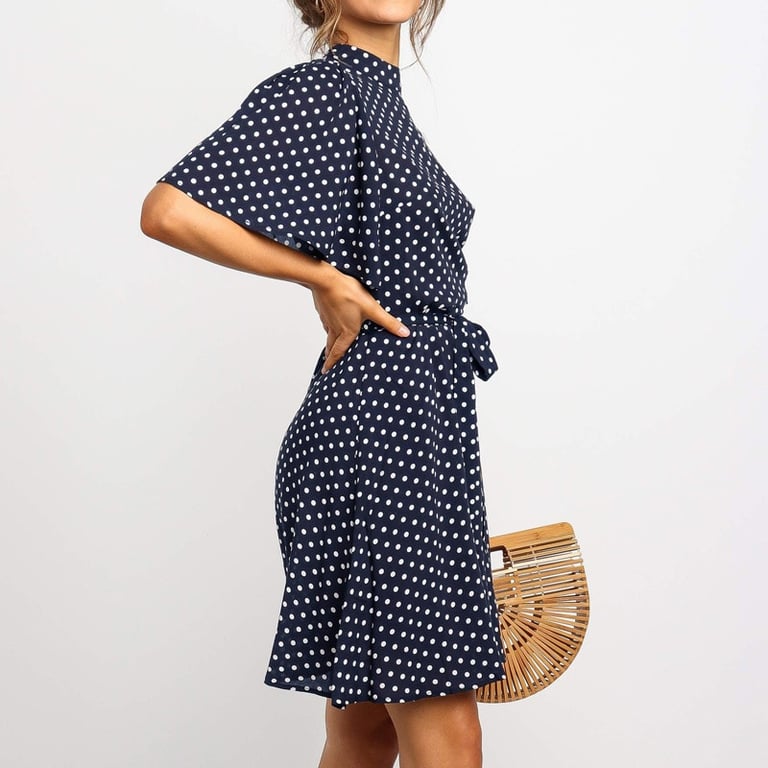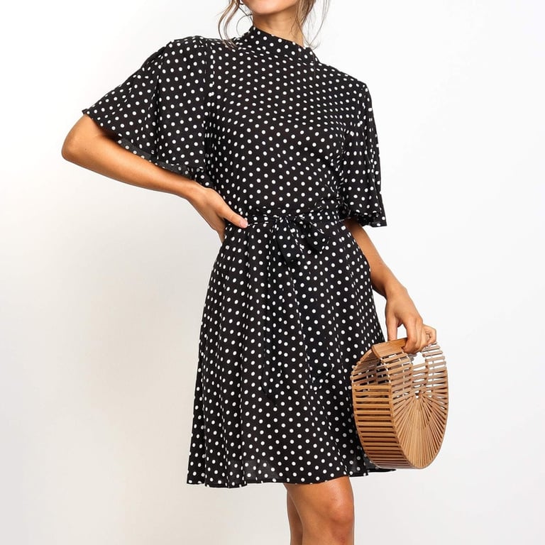 Abito corto da donna a pois con collo alto e maniche corte.