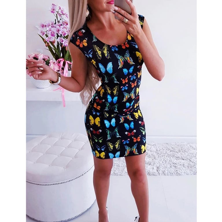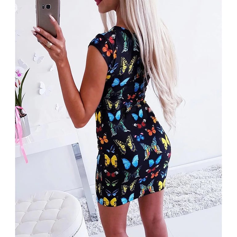 Un abito a tubino nero con farfalle arricchisce l'armadio di ogni donna. Si adatta perfettamente al corpo e mette in risalto le curve femminili. Ha maniche corte.