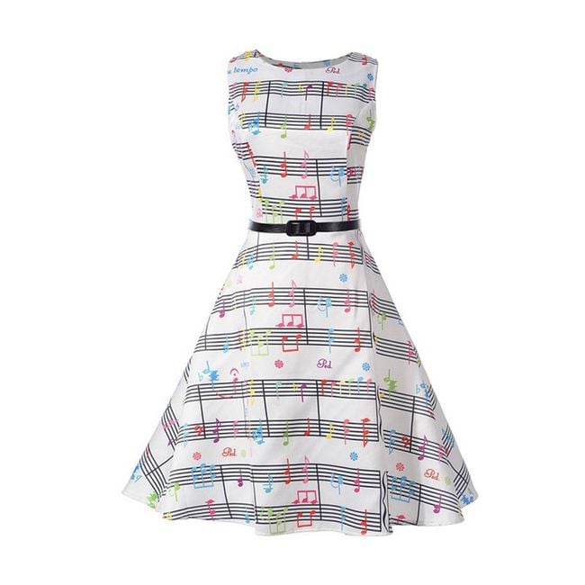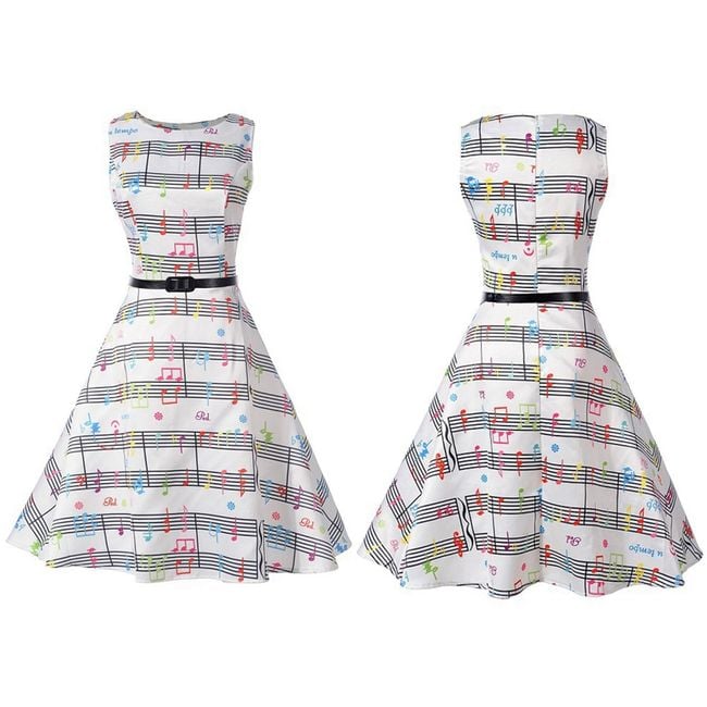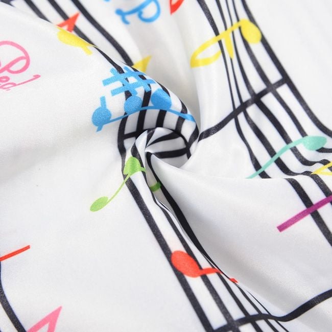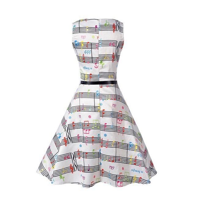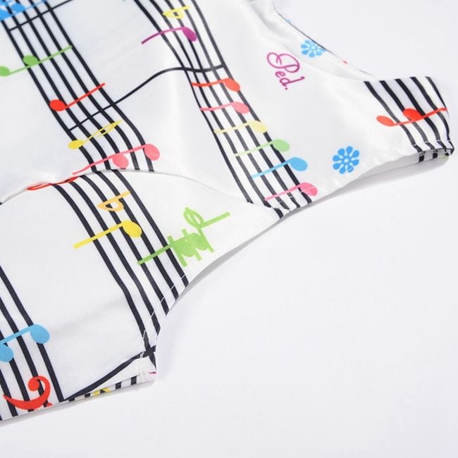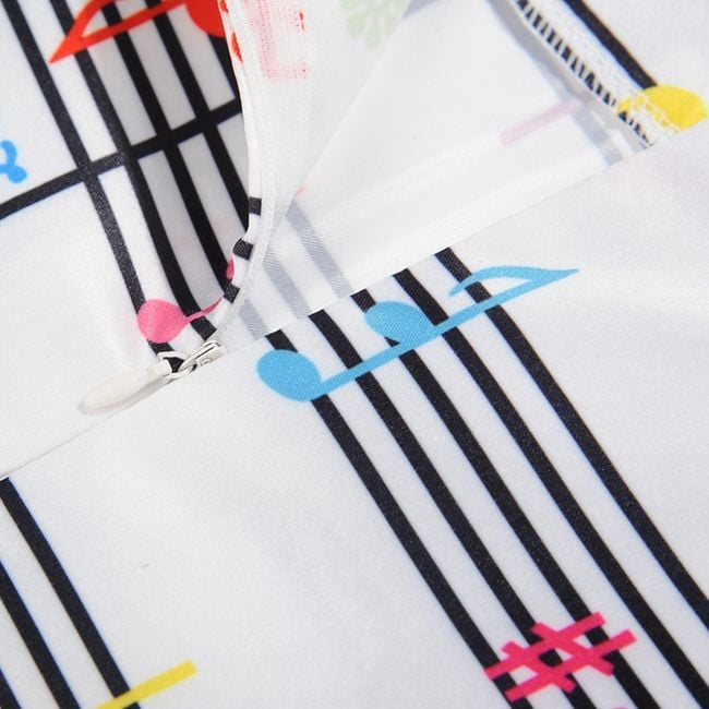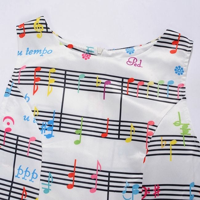 Il vestito con stampa originale è un pezzo di moda ideale per le giornate estive. Presenta un pentagramma con una varietà di note colorate.