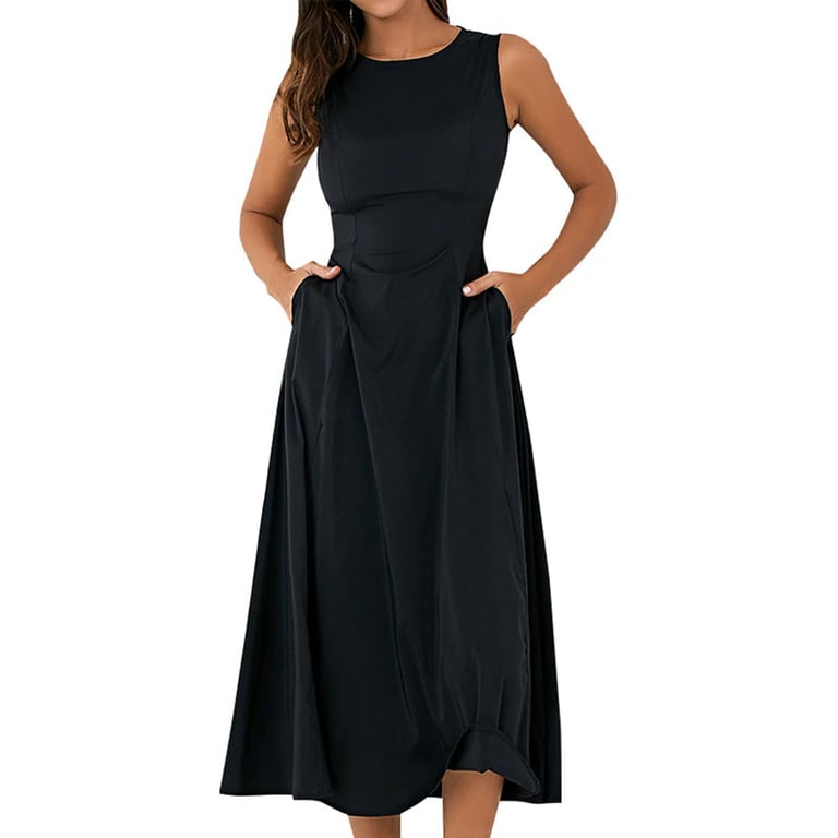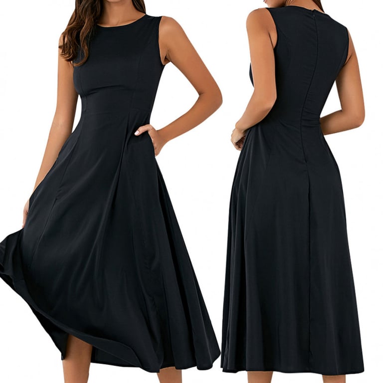 Abiti da donna con tasche laterali. Scollo in vita. Senza maniche. Gonna a forma di A con lunghezza fino al ginocchio. Disponibile in due colori.