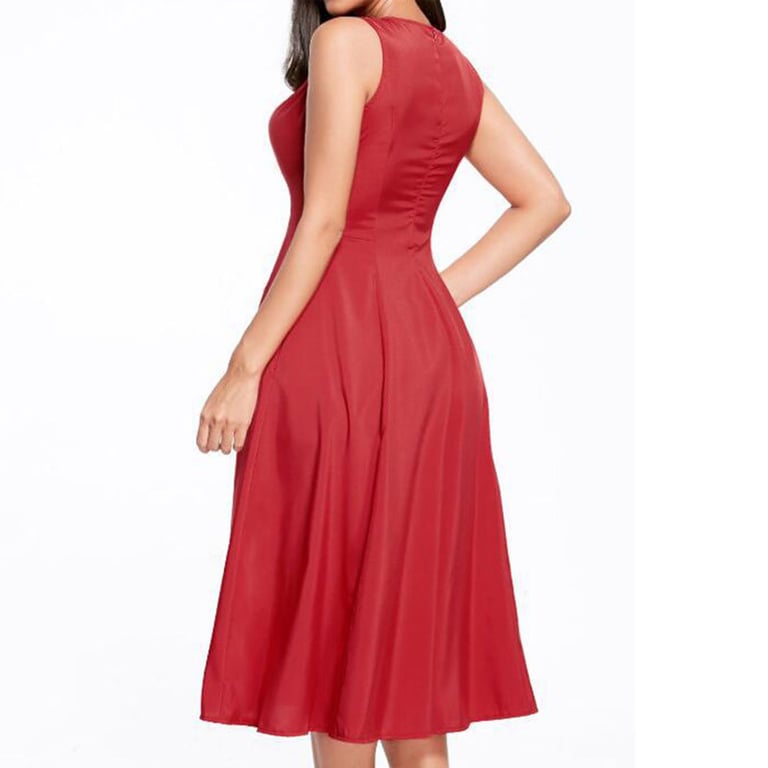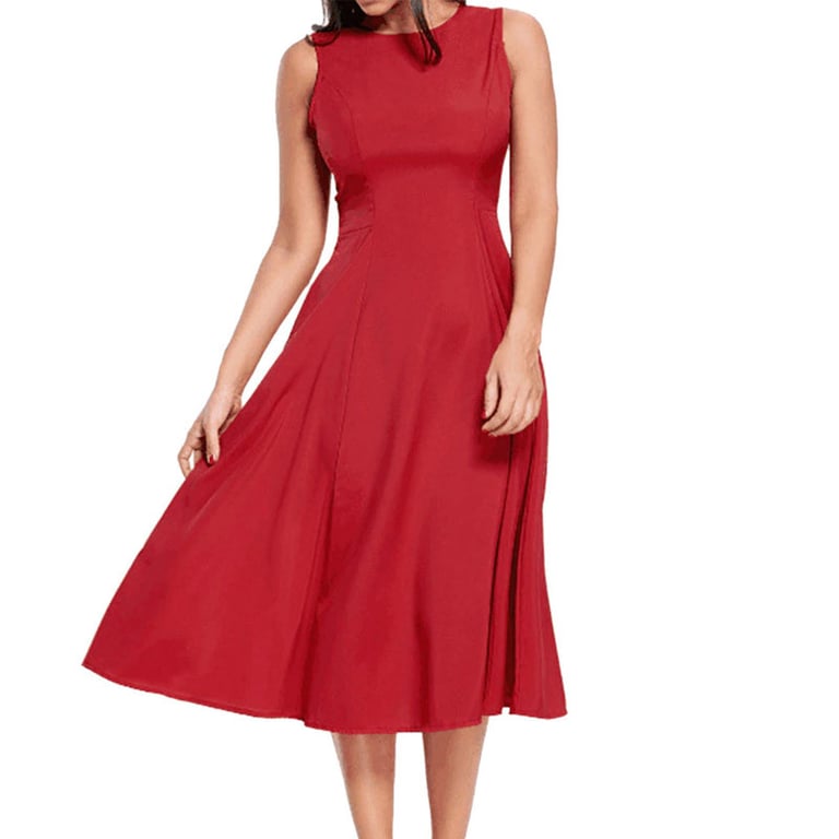 Abito da donna con tasche laterali. Scollo in vita. Senza maniche. Gonna a forma di A con lunghezza fino al ginocchio. Disponibile in due colori.
