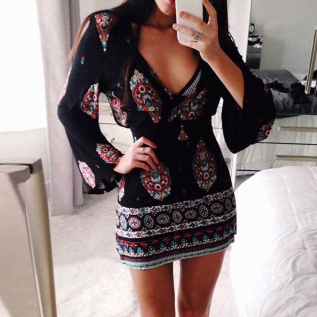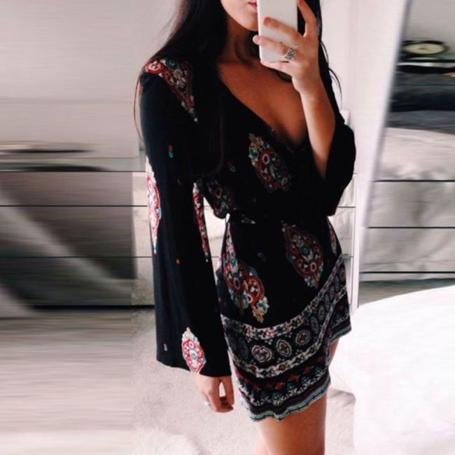 Abito da donna a taglio libero decorato con un elemento interessante in forma di motivi bohemien.