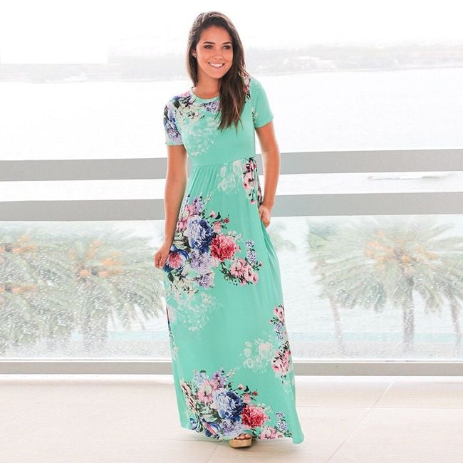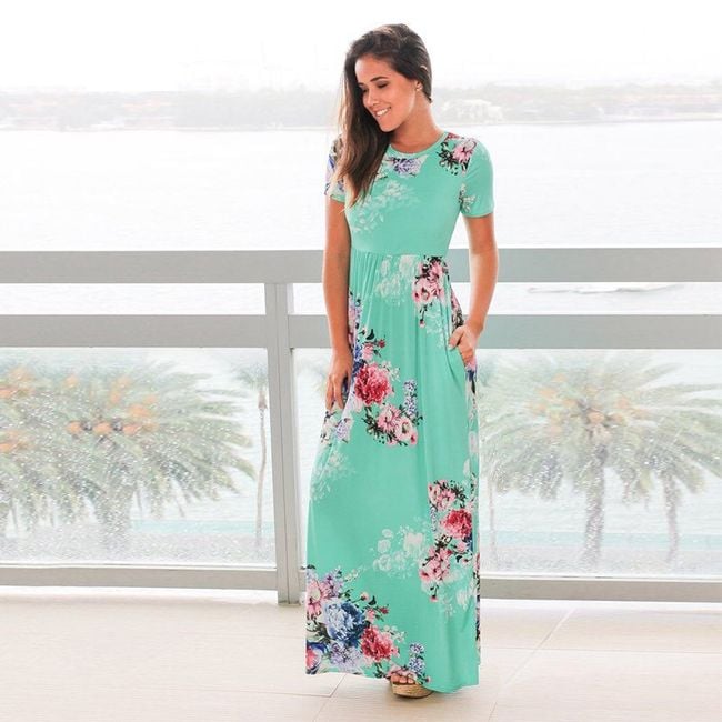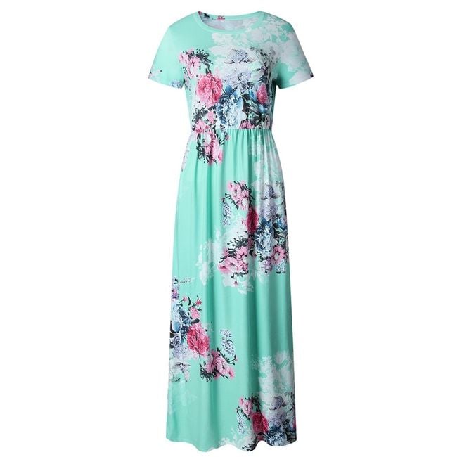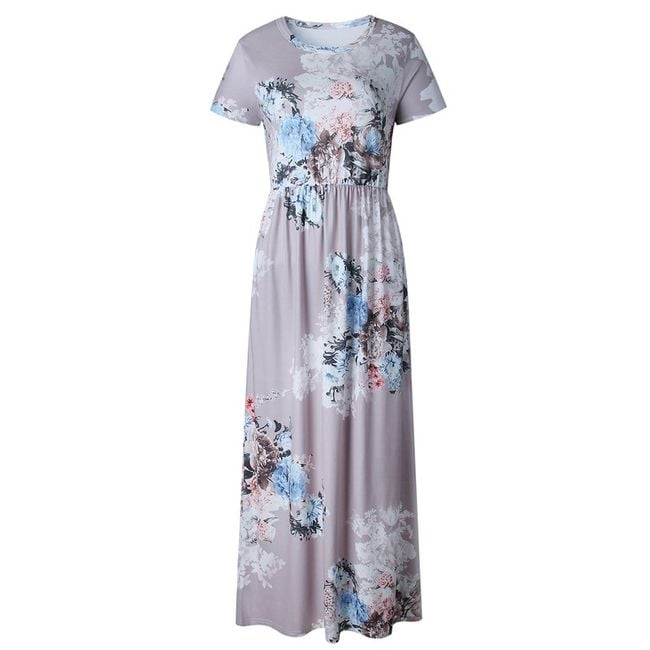 Abito lungo da donna a taglio libero con maniche corte, decorato con motivo floreale. Disponibile in 2 varianti di colore.