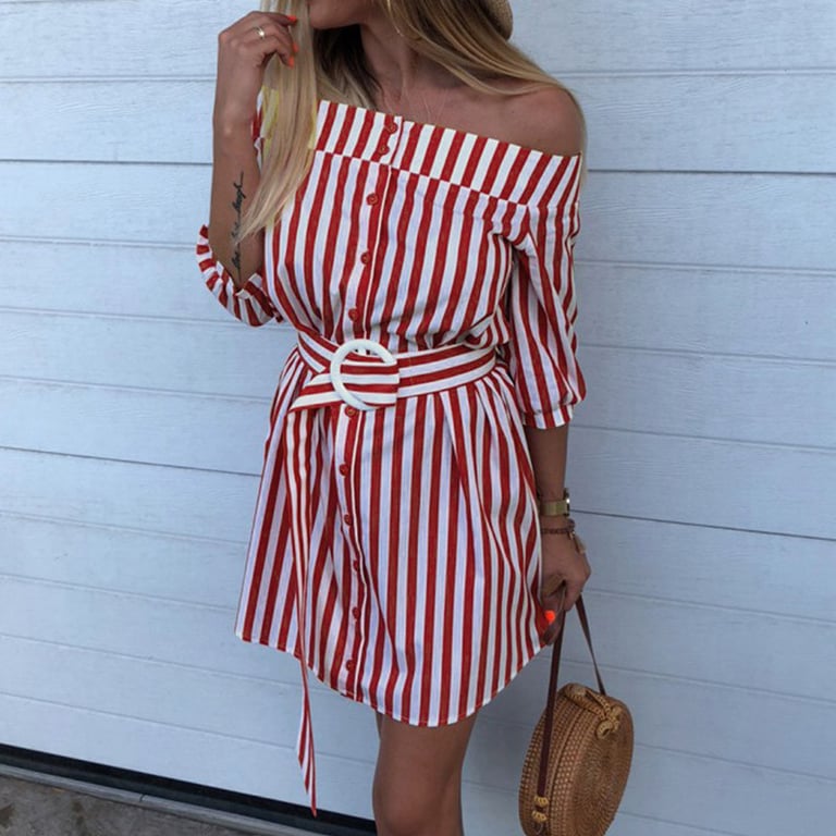 Abito da donna con motivo a righe. L'abito ha una scollatura con spalle scoperte. Taglio ampio con chiusura a bottoni e cintura con fibbia. Disponibile in diverse varianti.