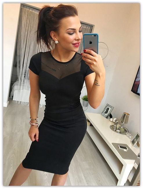 Abito elegante che puoi indossare sia a teatro che a una festa. La scollatura è creativamente realizzata con una rete trasparente che si estende anche sulla schiena.
