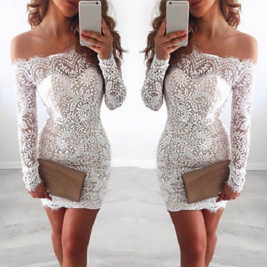 Bellissimo abito in pizzo bianco con delicato pizzo e spalle scoperte.