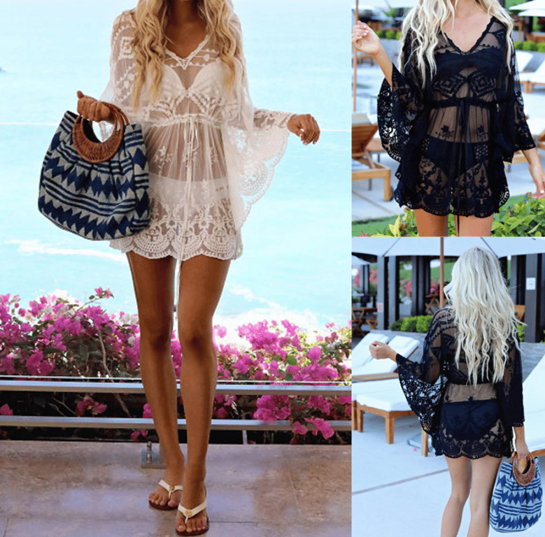 Indossa questo bellissimo vestito magari in spiaggia. È elegante e grazie alla sua trasparenza è anche molto sexy. È decorato con un bellissimo pizzo e maniche lunghe.