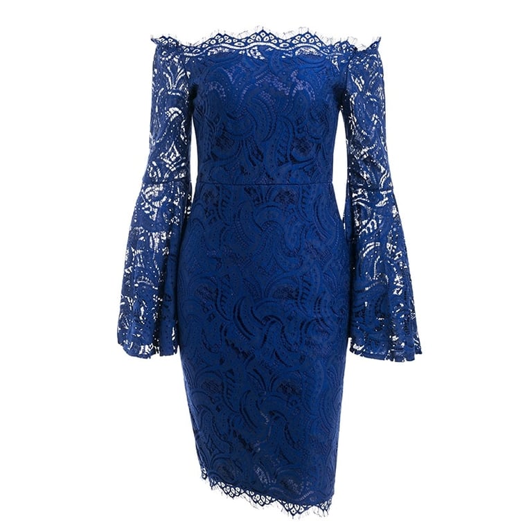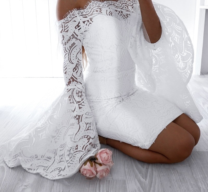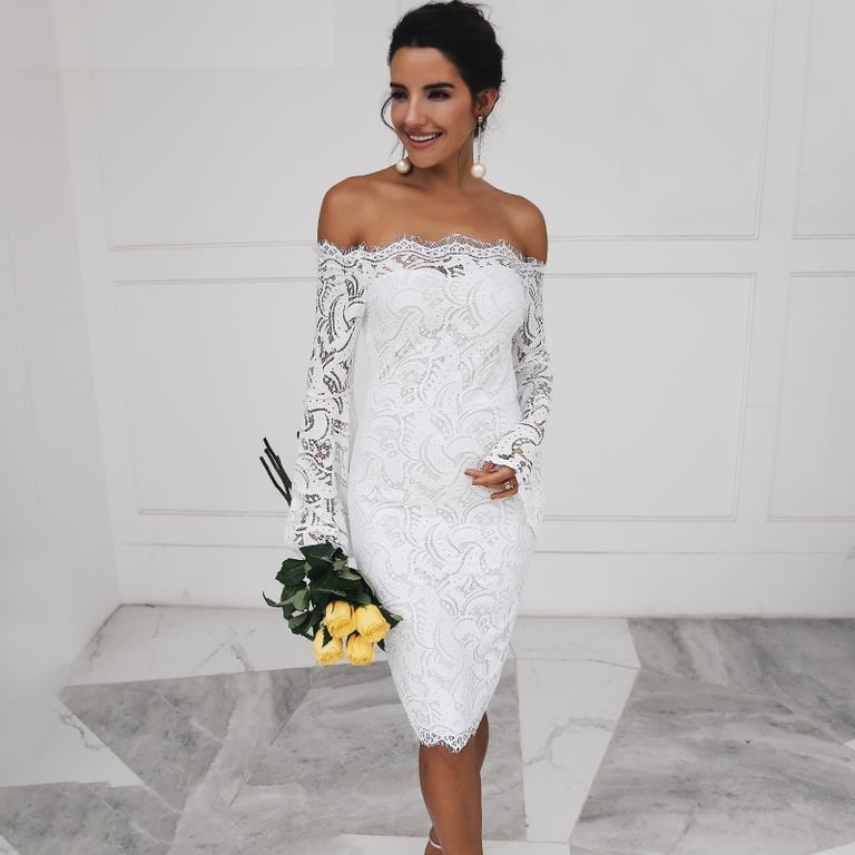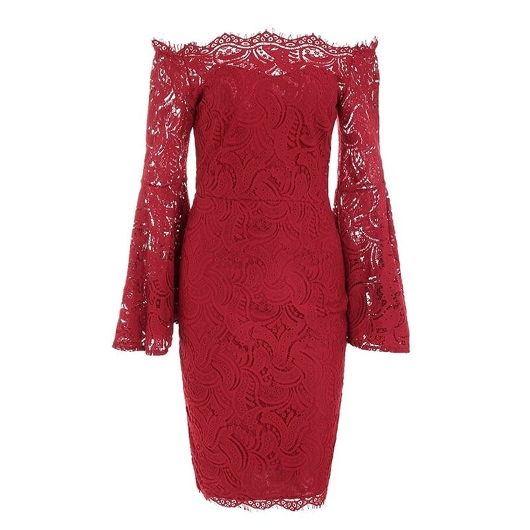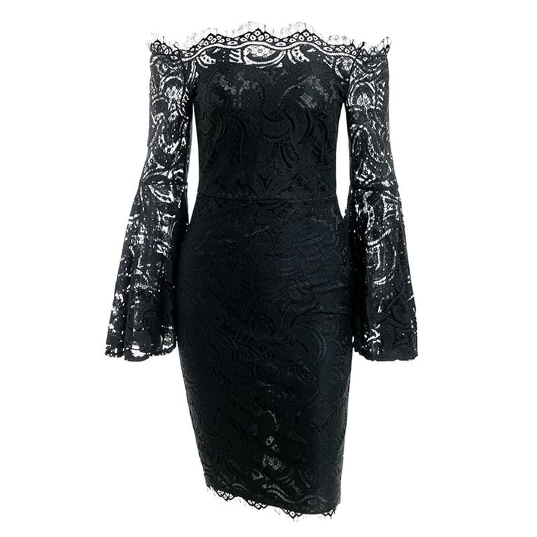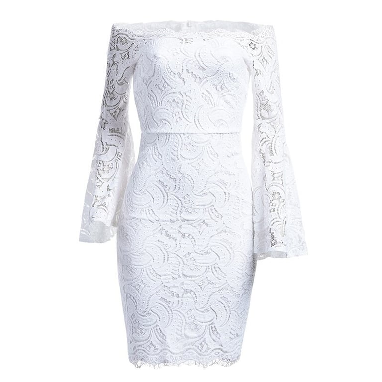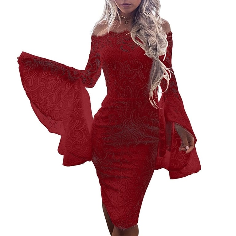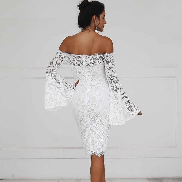 Abito da donna con spalle scoperte. Elegante lunghezza al ginocchio.