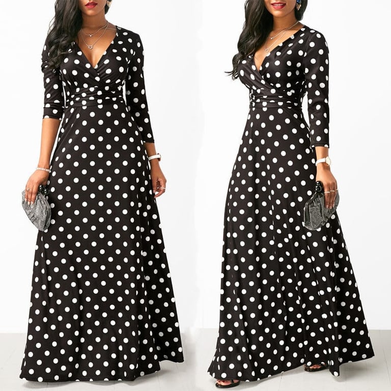Bellissimo abito maxi nero con grandi pois bianchi e scollatura profonda.