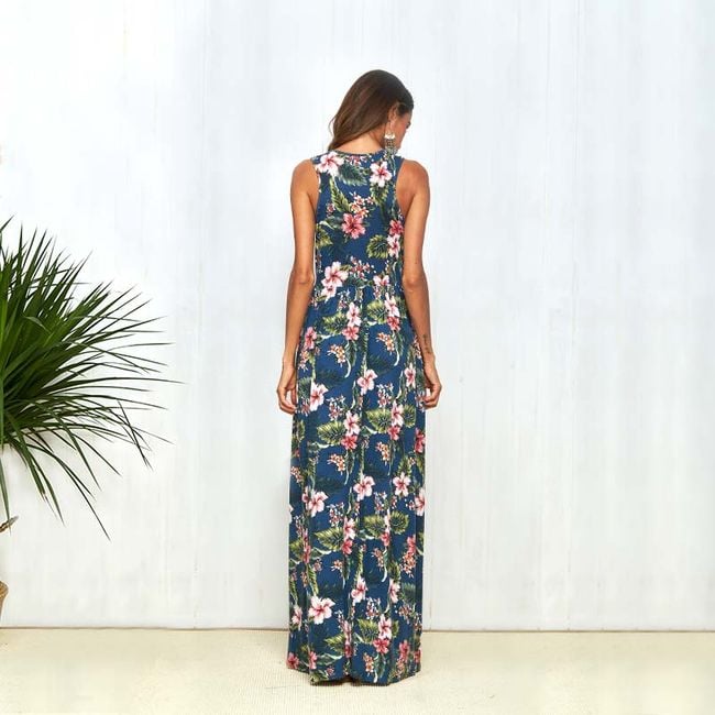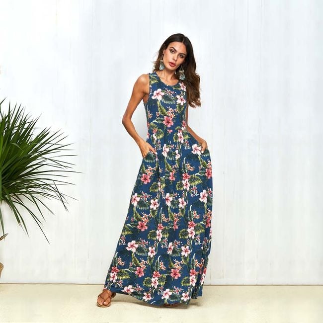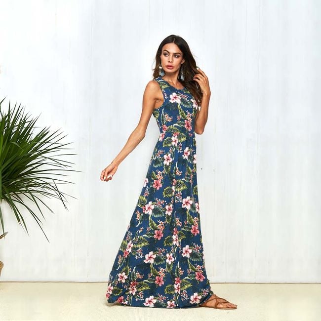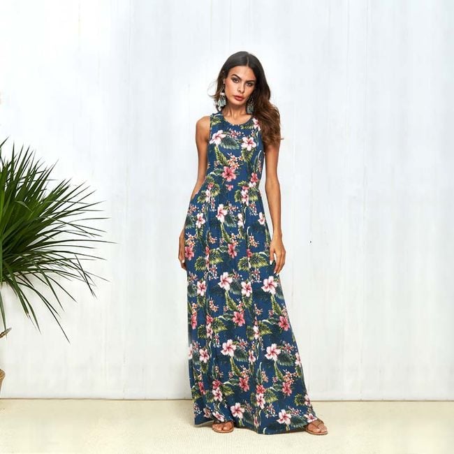 Abito da donna alla moda con taglio ampio, dotato di spalline larghe, materiale leggero e motivo di fiori in fiore.