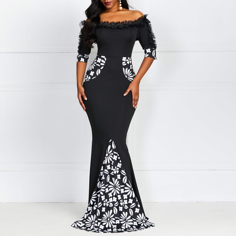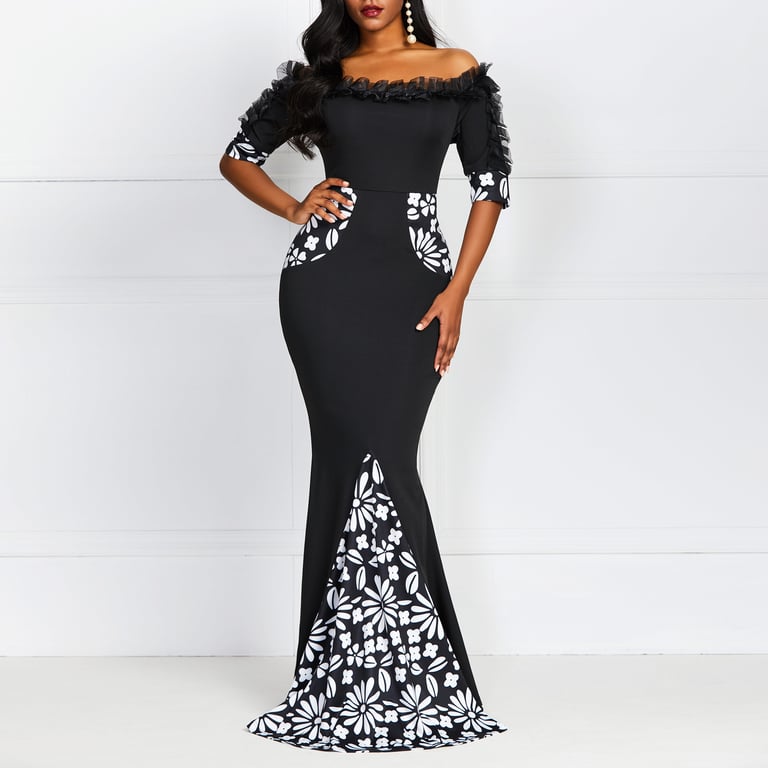 Abito nero elegante con spalle scoperte, lungo fino a terra.